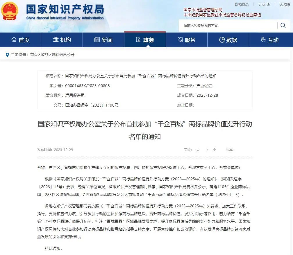 Ϊ¼Ó¿ìÍÆ½øÖªÊ¶²úȨǿ¹ú½¨Éè £¬ÉîÈëʵʩÉÌ±êÆ·ÅÆÕ½ÂÔ £¬´Ù½øÆóÒµºÍÇøÓòÉÌ±êÆ·ÅÆ¼ÛÖµÌáÉý £¬ÖúÁ¦¾­¼Ã¸ßÖÊÁ¿Éú³¤ £¬2023Äê4Ô £¬¹ú¼Ò֪ʶ²úȨ¾Ö¿ªÕ¹¡°Ç§Æó°Ù³Ç¡±ÉÌ±êÆ·ÅÆ¼ÛÖµÌáÉýÐж¯¡£¶ÔÈëÑ¡µ¥Ôª £¬¸÷µØ·½ÖªÊ¶²úȨ¹ÜÀí²¿ÃŽ«Í¨¹ý¼Ó´óÊÂÇéÁªÏµ¡¢Ö¸µ¼¡¢Ö§³ÖºÍÐû´«Á¦¶È £¬Òýµ¼ÈëÑ¡µ¥Ôª¼ÓÇ¿ÉÌ±êÆ·ÅÆ½¨Éè £¬ÌáÉýÉÌ±êÆ·ÅÆ¼ÛÖµ £¬·¢»ÓÒýÁìʾ·¶×÷Óà £¬×ÅÁ¦ÅàÓý¡°Ç§Æóǧ±ê¡±ÆóÒµÉÌ±êÆ·ÅÆ¼ÛÖµÌáÉý·¶Àý £¬¹ú¼Ò֪ʶ²úȨ¾Ö½«¼Ó´óÖ¸µ¼Ö§³ÖÁ¦¶È £¬¿ªÕ¹Ðû´«ÍƹãºÍ³ÉЧÆÀ¼Û £¬ÓÐЧ·¢»ÓÉÌ±êÆ·ÅÆ¶Ô¾­¼Ã¸ßÖÊÁ¿Éú³¤µÄÒýÁìºÍÖ§³Å×÷Óá£